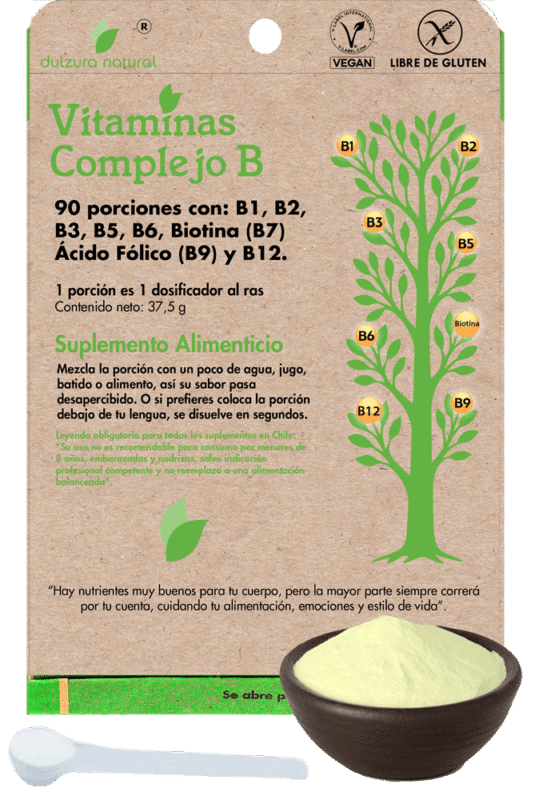 - 90 porciones con vitaminas B1, B2, B3, B5, B6, Biotina, B9 y B12